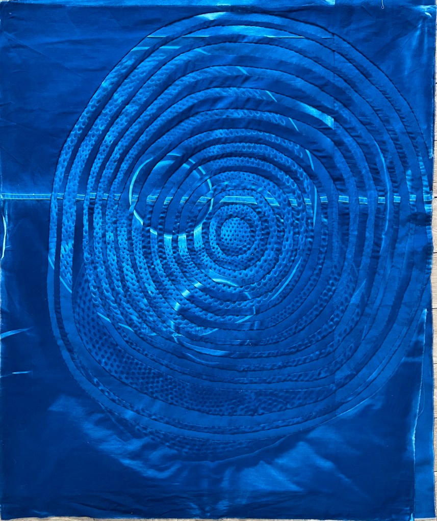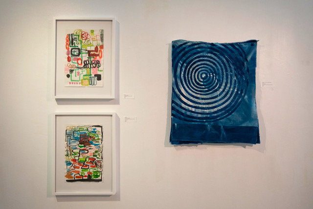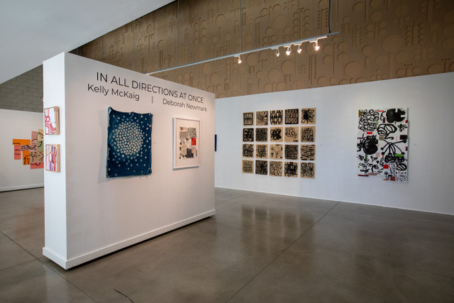 That dynamic emerges immediately in the pairing of one of McKaig’s soft blue textiles with one of Newmark’s framed collages. McKaig’s composition radiates without resistance, its circular pattern spreading across cloth as though it could continue beyond the edge if given more room.