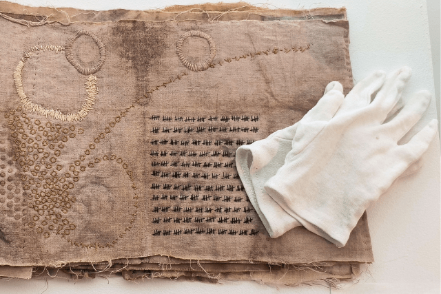 The repeated stitched marks across the pages suggest counting or record-keeping, recalling ways of tracking value and quantity through repeated signs rather than written text. They could refer to something ordinary, such as supplies or daily use, or to something more ominous, such as losses, warnings, or debts.