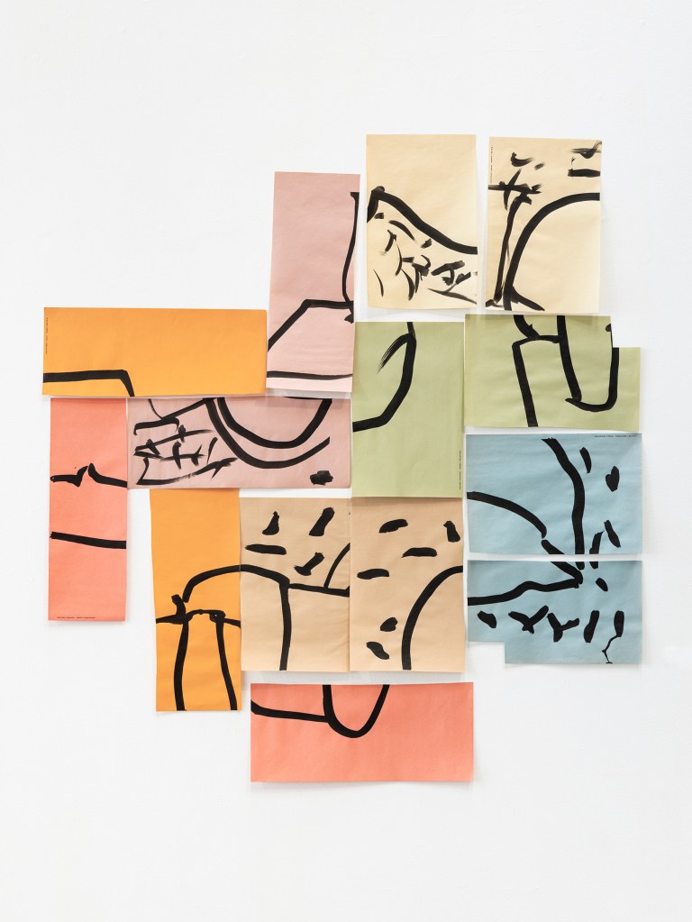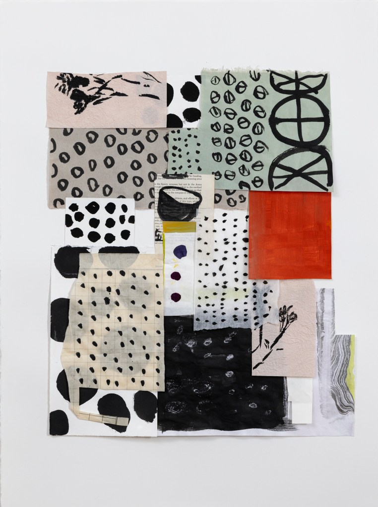 That same quality continues in another Newmark collage, where soft, dusty color and dark linear elements suggest the partial reconstruction of an artifact recovered in damaged condition. The composition holds the authority of something pieced back through intuition and guesswork, convincing yet slightly off. That wrongness is part of its power. Sun-worn, handled, and translated across time, it belongs to a world of sediment, weather, ruin, and endurance while still asking to be understood in the present.