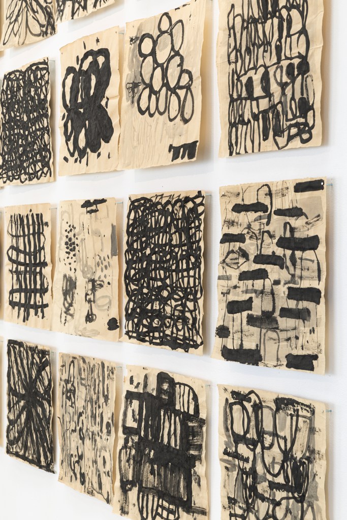 A nearby grid deepens this sense of coded transmission in Newmark’s practice. These works present themselves as remnants of an older order, carrying a message that has reached us only in partial form. Orbicular motifs, reticulated structures, aggregated marks, and stellate forms unfold across worn, chartaceous surfaces. The effect is pseudo-archaeological, offering not clarity so much as evidence, traces of a language that survives only in scraps.