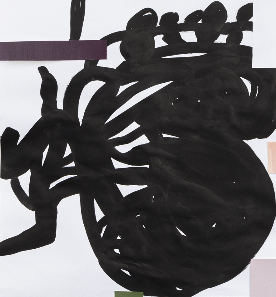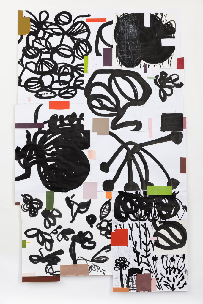 Newmark approaches the surface through density. In one large, seemingly paper-stitched composition, black moves across the field with authority. Color enters, though it never overtakes the dark marks. Those passages of black resist easy symbolic habits, especially the impulse to treat darkness as damage or threat. Here it becomes regenerative. Floral shapes rise through it. Gestural masses coil and gather.