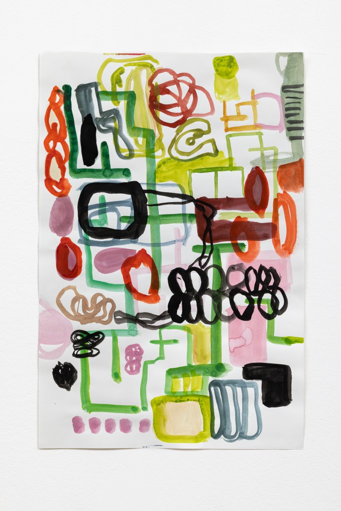 A subtler Newmark work near the close of the exhibition participates in that same tension. Pinks and greens introduce vitality, while heavier black passages press against the field with greater force. A clustered dark shape near the right side recalls teeth or cells. The composition resists settling into a single interpretation, hovering between bloom and threat and health and decay.