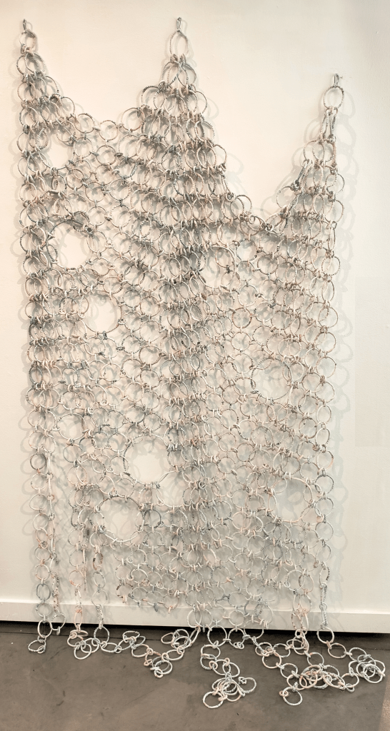 Elsewhere, McKaig introduces a different register through a hanging construction made of rings and thread. At first glance it recalls a net and therefore the idea of capture. Yet it resists full usefulness. Many of its openings are too wide, and it spills onto the floor with an exhausted grace that shifts it away from containment and toward release.