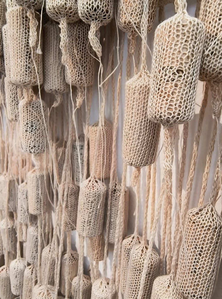 McKaig, by contrast, repeatedly moves toward a marine register. Silvery, saline residues and a faint sandy grit cling to the surfaces, reinforcing a sense of mineral saturation. Suspended threads, ringed elements, and open meshes suggest forms altered by submersion and pressure. The impression is less of construction than of recovery, as though these objects have been drawn up from a dark, sedimented below.