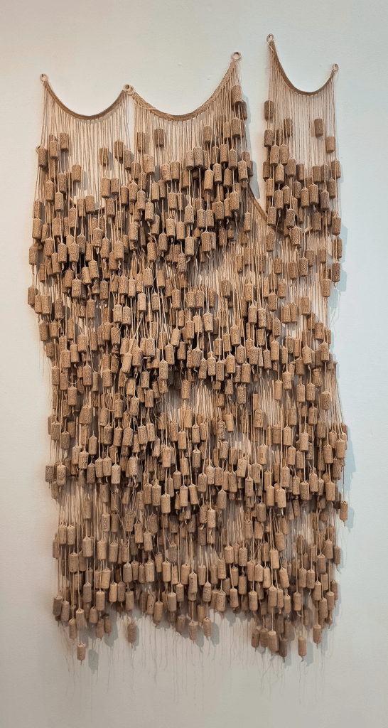 One hanging construction in particular, composed of thread, bars, cork, and plastic rings, suggests a device whose purpose has outlived explanation. It may once have served gathering, measuring, trapping, labor, navigation, or ritual. The object hangs as debris pulled from water and preserved after its original use was forgotten.